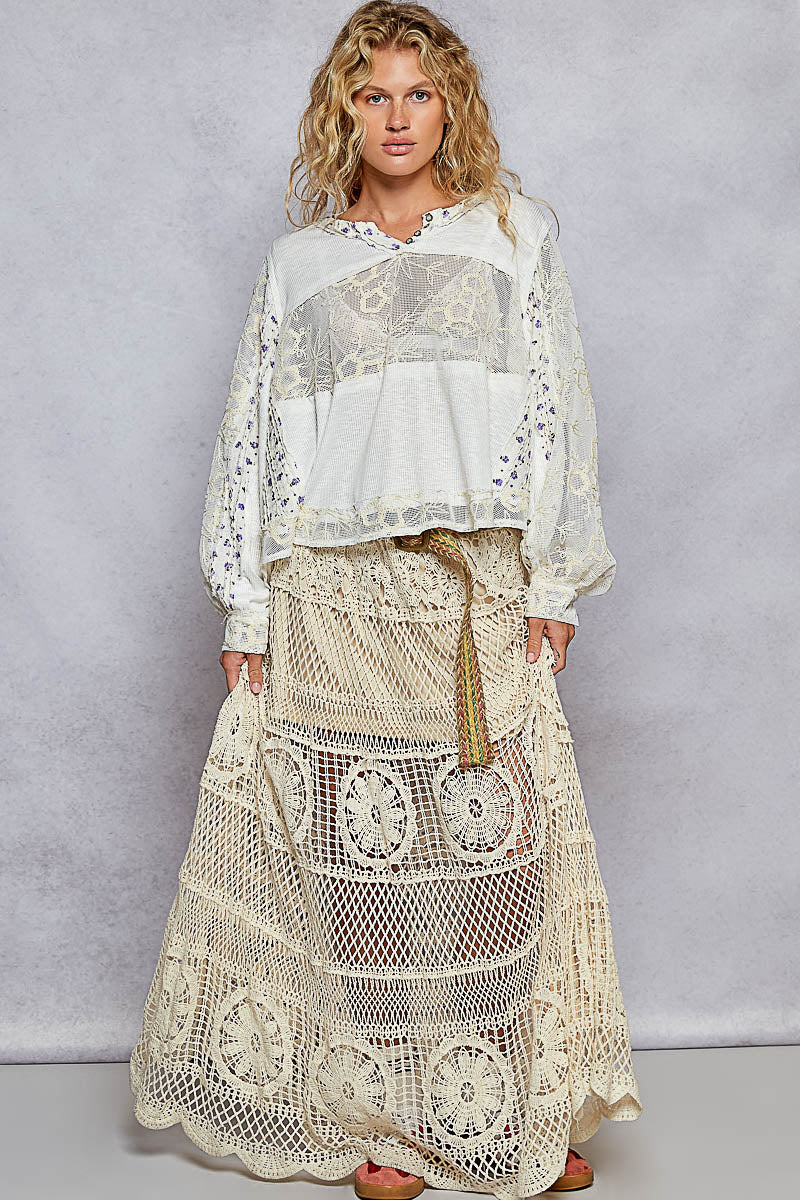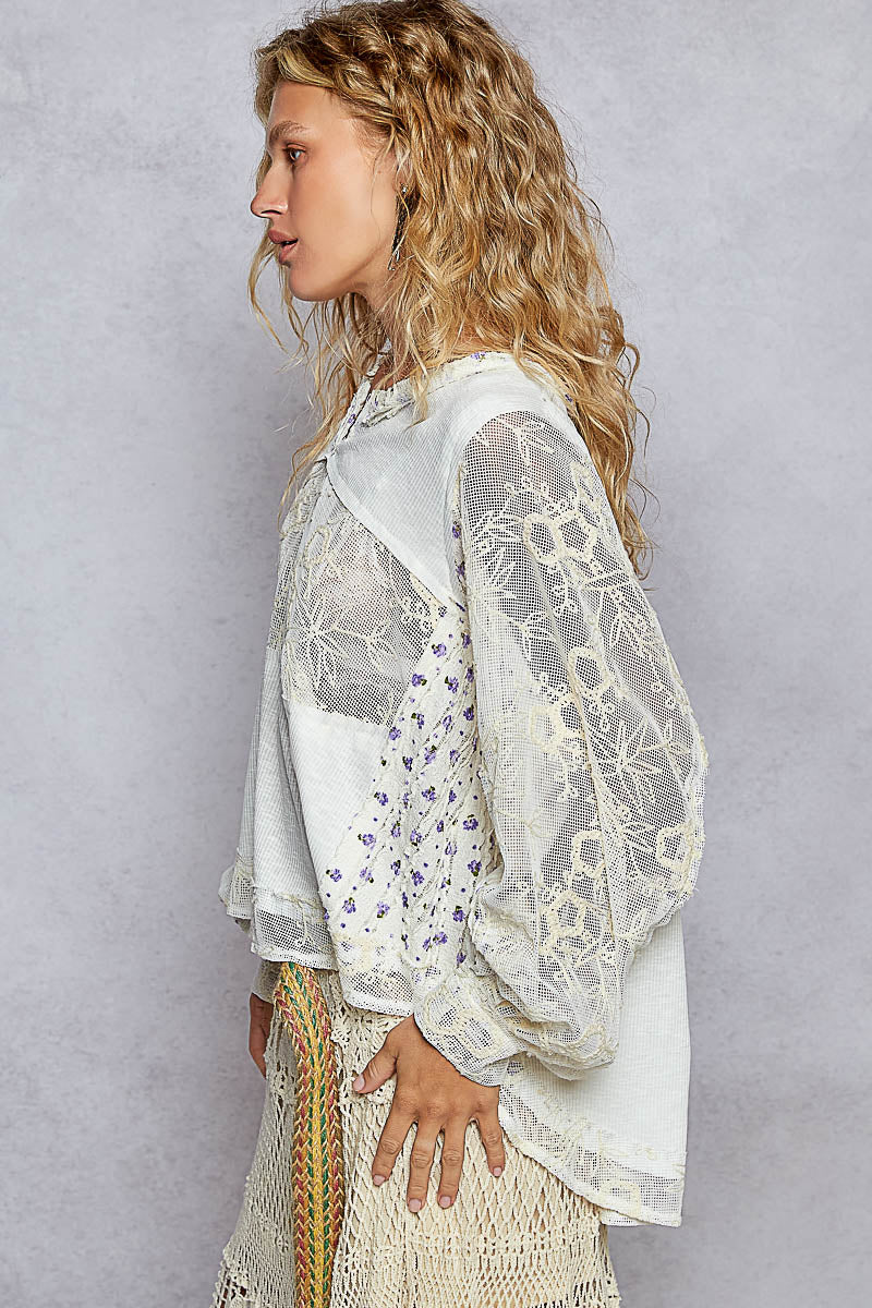 Add a touch of romance to your wardrobe with this stunning white, lace shirt, adorned with delicate purple flowers for a soft, feminine charm. The intricate lace detailing enhances its airy, elegant feel, while the floral accents bring a subtle touch of color. Lightweight fabric. Perfect for layering.