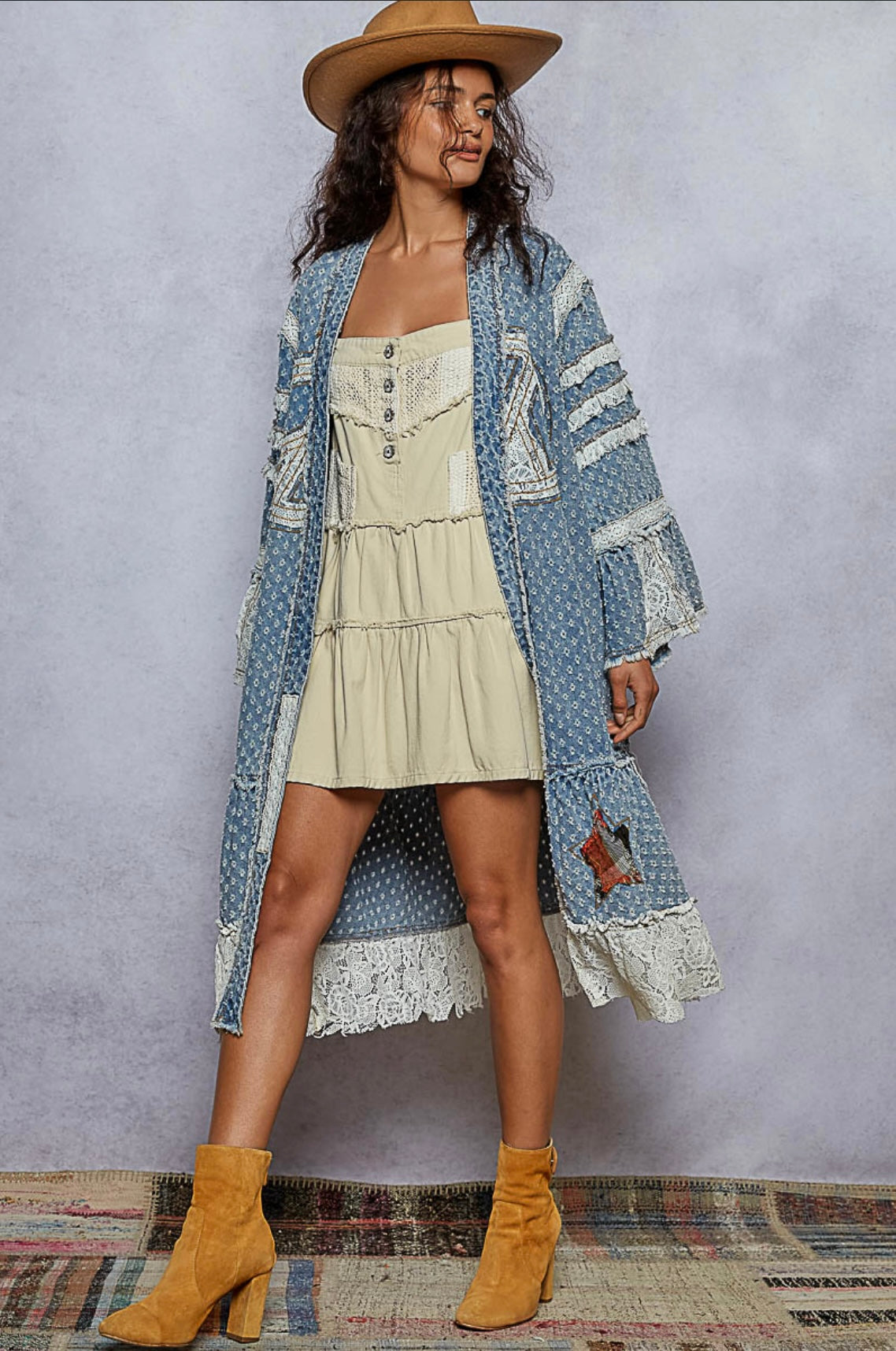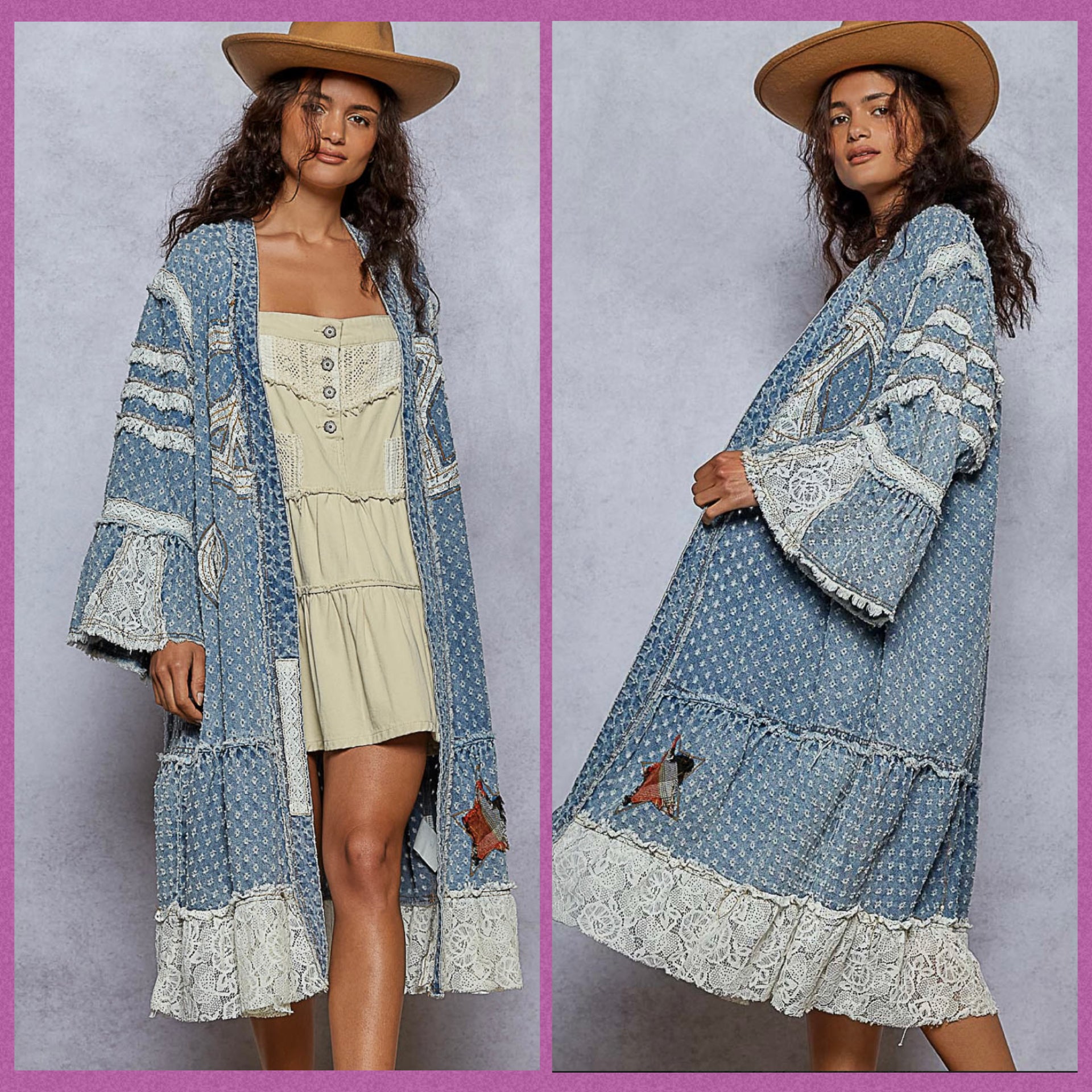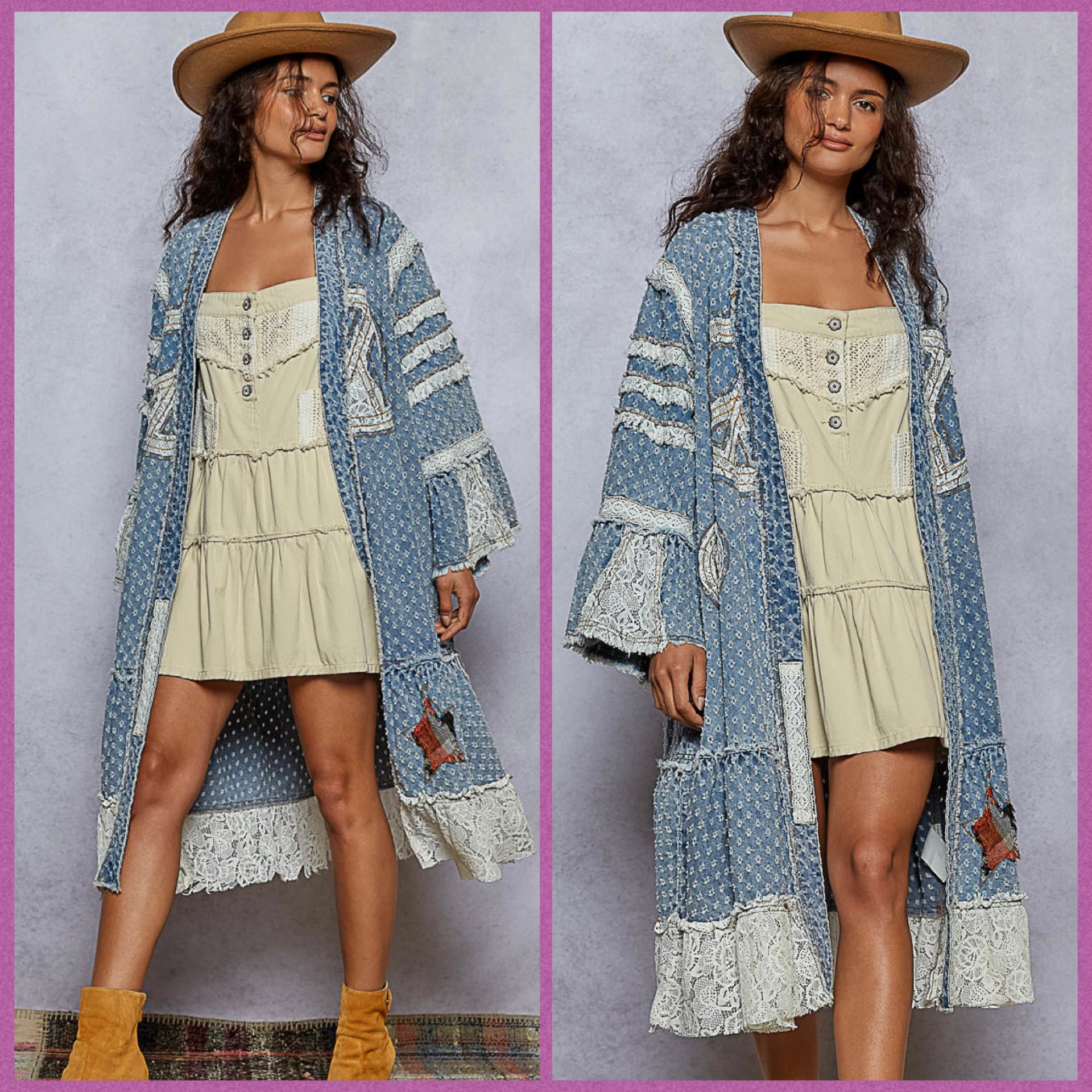 Bold, unapologetic, and beautifully layered—the Peacekeeper Duster is more than a fashion piece; it’s a wearable manifesto. Crafted in jet-black or blue denim with striking white lace accents, this longline coat commands attention with its oversized peace symbol emblazoned across the back—a nod to unity, rebellion, and radical softness.