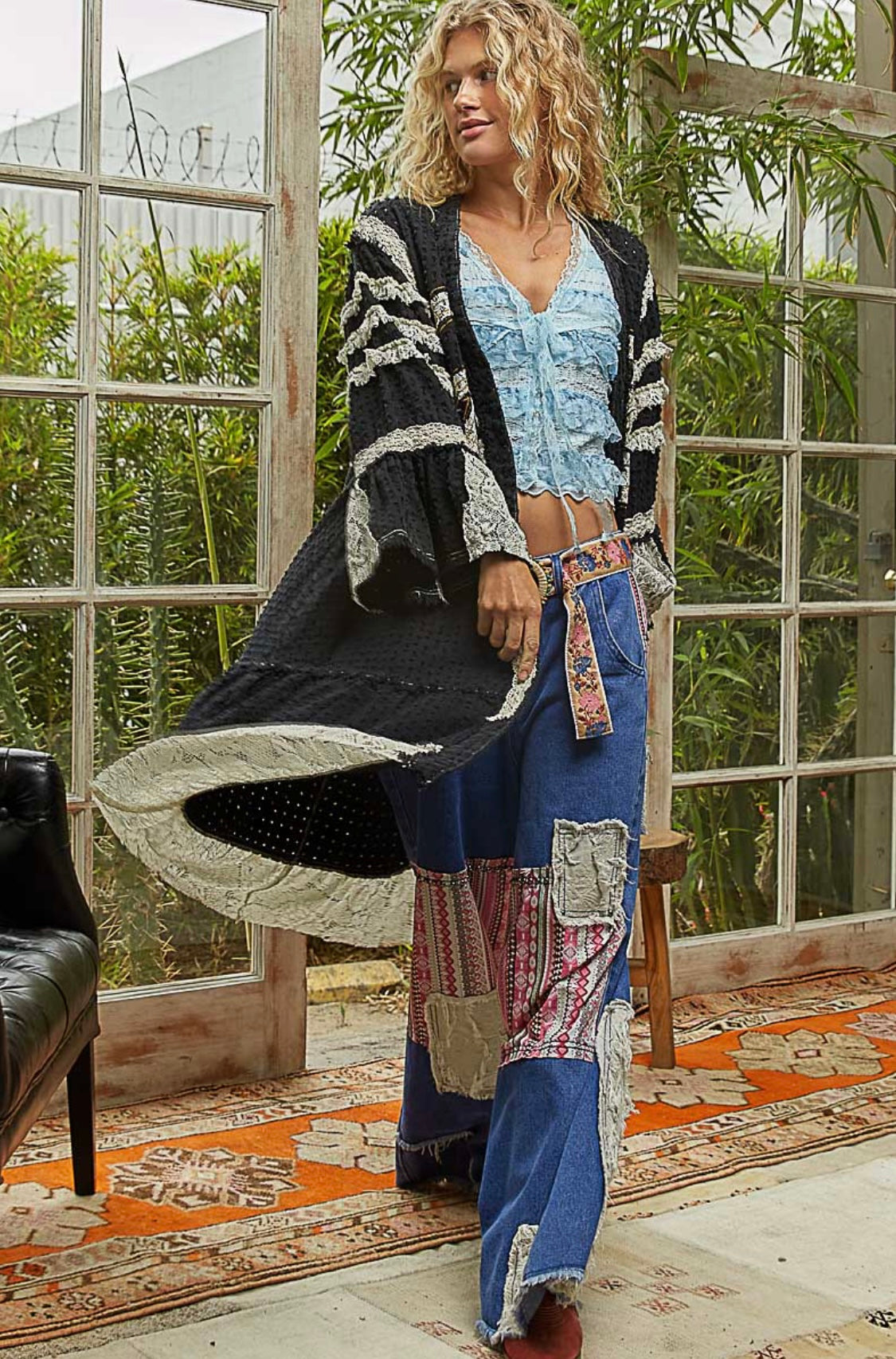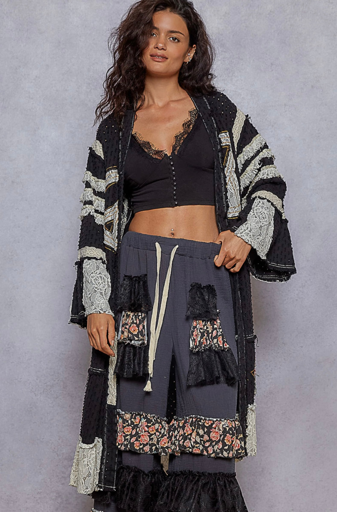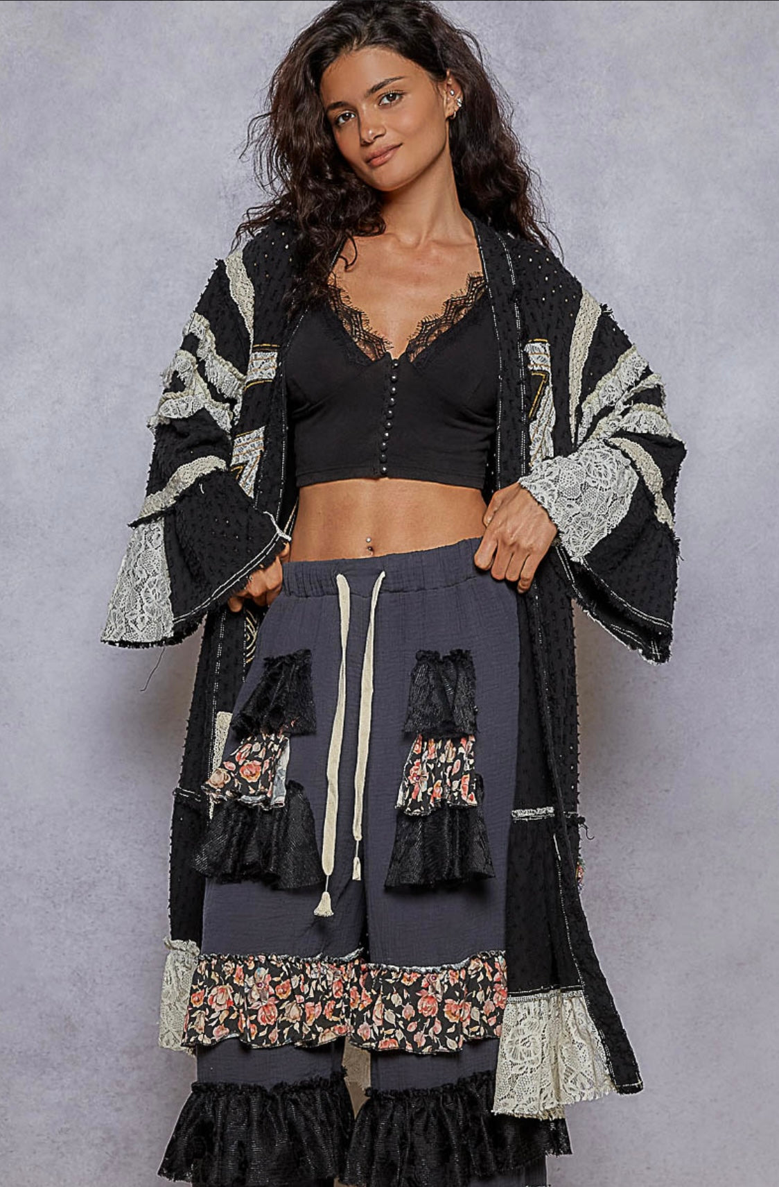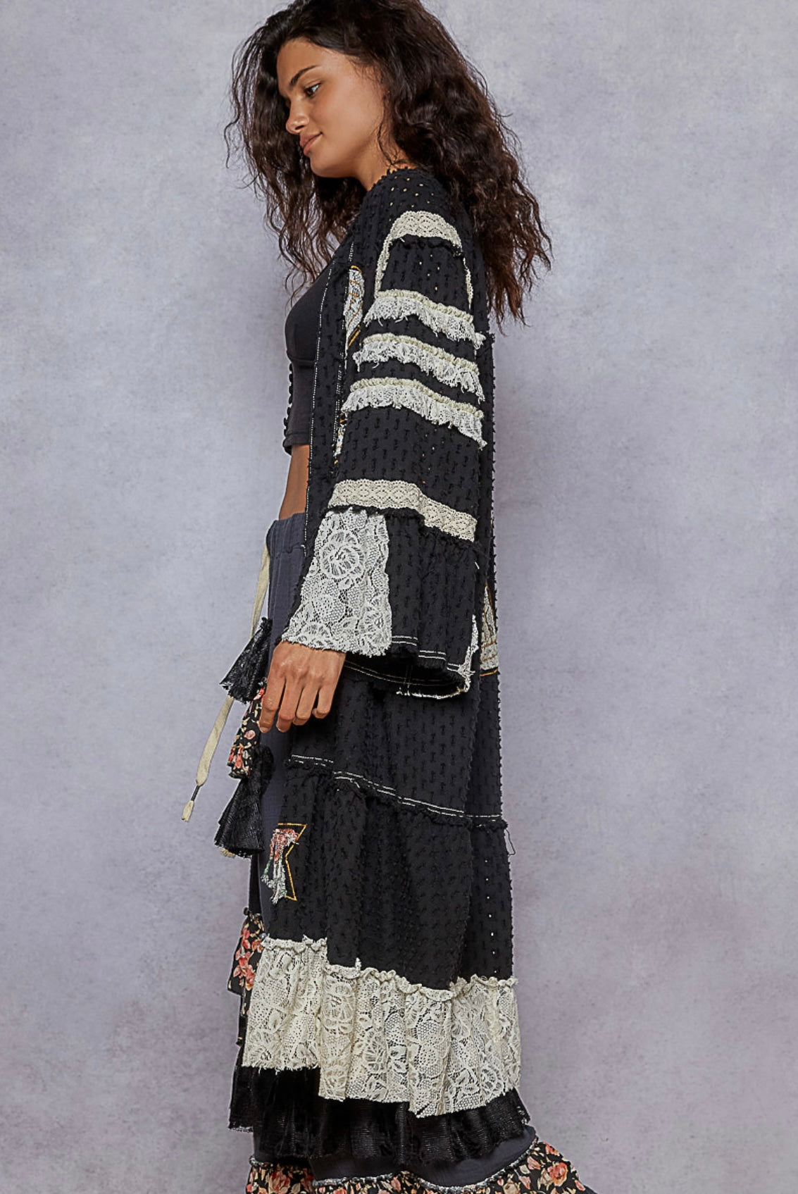 White lace ruffles wrap the sleeves in a graphic rhythm, while the hemline cascades into delicate lace ruffles, adding a romantic twist to its streetwise silhouette. Whether you're styling it over distressed denim or letting it flow over a slip dress, this duster turns every sidewalk into a runway.